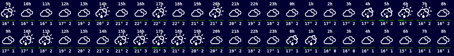 The line above will display an image that will display the icon for the first forecasted hour. If you want the forecast for the next 48 hours, you will have to define 48 lines like this, only changing the 0 with the hour you want: